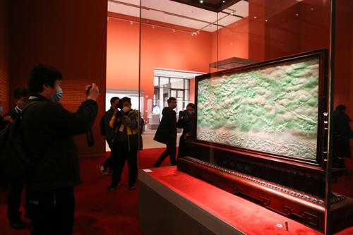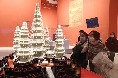图片说明:观众参观展出的玉雕白玉《五行塔》。