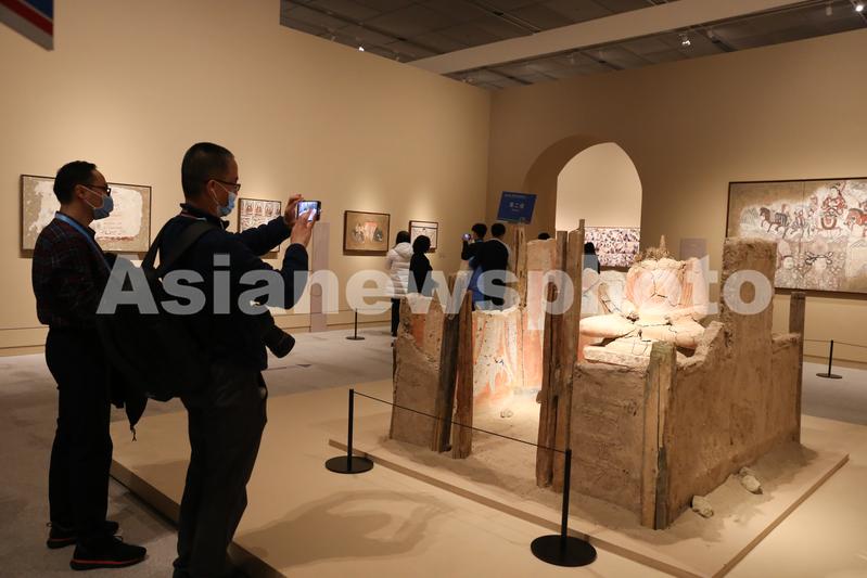 图片说明:媒体记者拍摄展出的达玛沟小佛寺遗址复原(等大复制)。