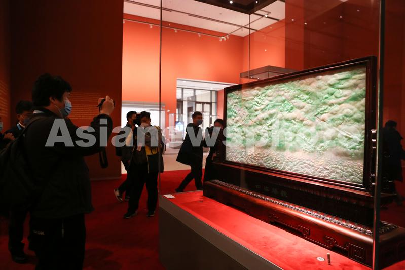 图片说明:媒体记者拍摄展出的翡翠插屏《四海腾欢》。