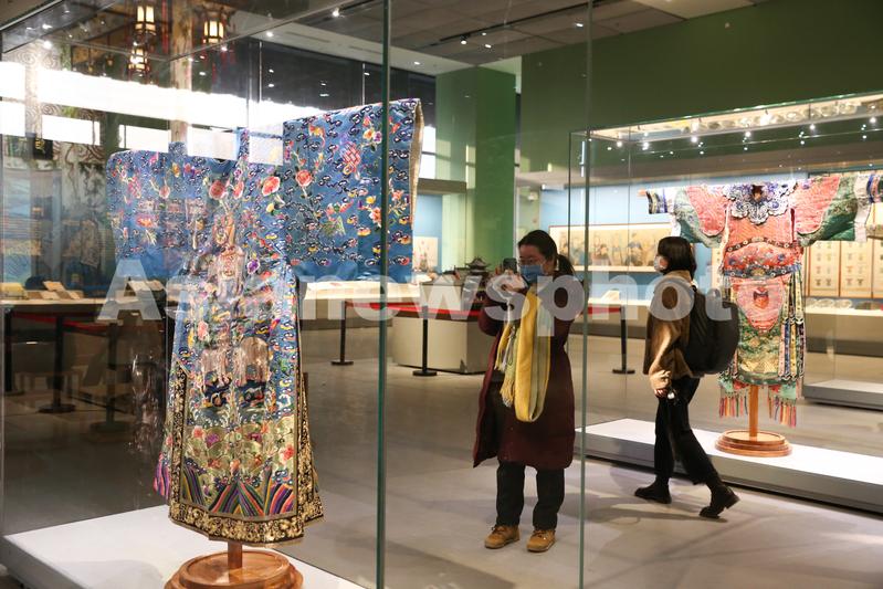 图片说明:媒体记者拍摄展出的传统戏服。