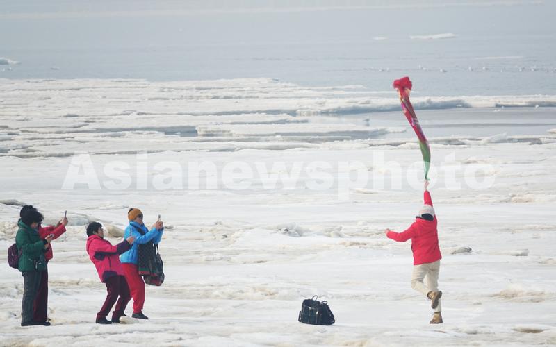 图片说明:2022年2月11日,游客在辽宁省大连市甘井子区夏家河海滨浴场踏冰赏景、拍照。