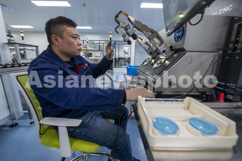 图片说明:2022年2月15日,江苏欧陆智造镜片有限公司的技术人员正在无尘车间制作镜片。