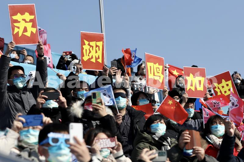 2月15日,观众在比赛现场为中国选手苏翊鸣加油。