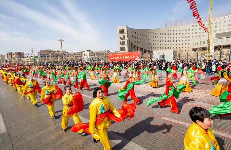 2022年2月13日,参演人员在库车市胜利路进行民俗和社火表演。