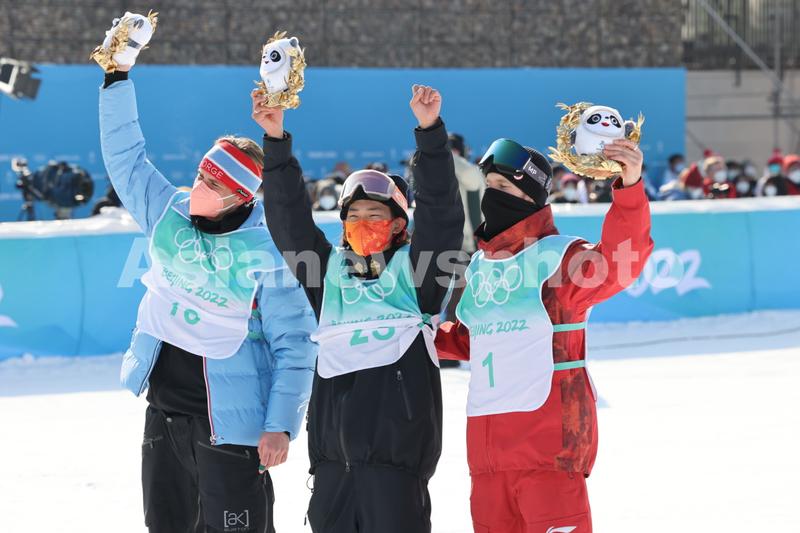 2月15日,冠军中国选手苏翊鸣(中)、亚军挪威选手蒙斯·勒伊斯韦兰(左)、季军加拿大选手马克斯·帕罗特在纪念品颁发仪式上。