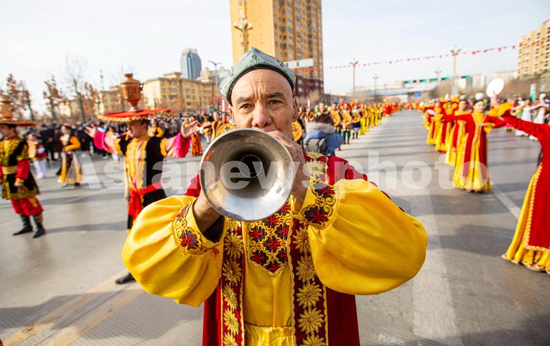 2022年2月13日,参演人员在库车市胜利路进行民俗和社火表演。