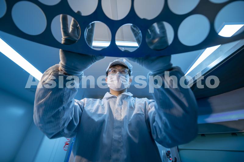 图片说明:2022年2月15日,江苏欧陆智造镜片有限公司的技术人员正在无尘车间制作镜片。