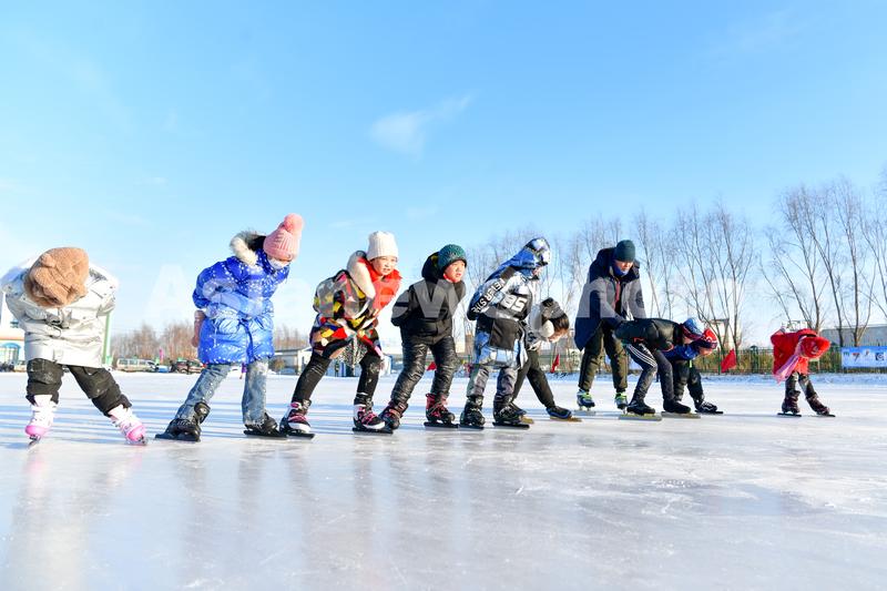 2022年2月6日,黑龙江省双鸭山市友谊县友谊镇,滑冰场内热闹非凡,孩子们在冰面上追逐嬉戏,尽情享受冰雪运动的乐趣。