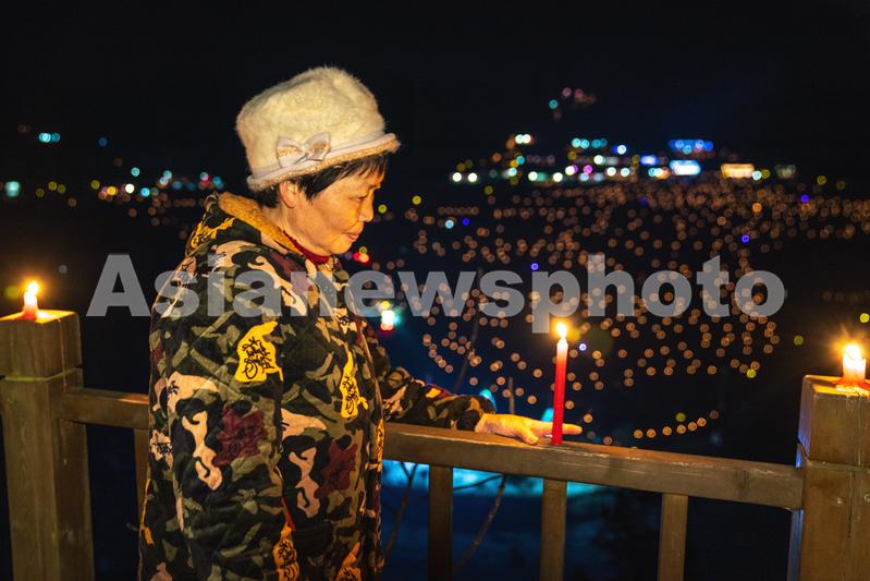 2022年2月15日,湖北恩施州恩施市盛家坝镇二官寨村旧铺古寨的一位土家农民在户外路边点路烛,庆祝元宵节。