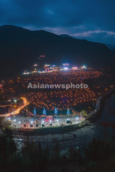 2022年2月15日,湖北恩施州恩施市盛家坝镇二官寨村旧铺古寨的土家农民用一万多支蜡烛点亮山寨,庆祝元宵节。