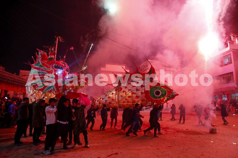 图片说明:2022年2月16日,在安徽省黄山市,汪满田鱼灯表演队伍正在村中嬉游祈福。