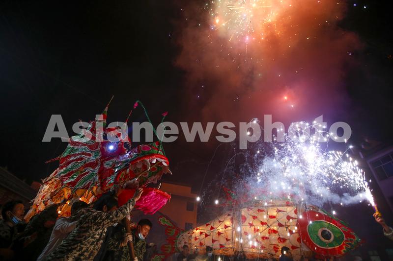 图片说明:2022年2月16日,在安徽省黄山市,汪满田鱼灯表演队伍正在村中嬉游祈福。