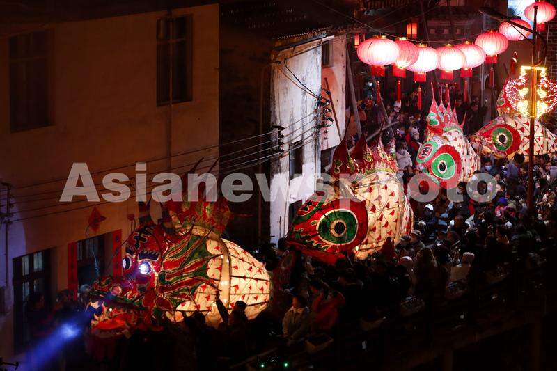 图片说明:2022年2月16日,在安徽省黄山市,汪满田鱼灯表演队伍正在村中嬉游祈福。