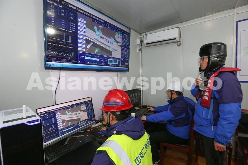 2月17日,在湖北省襄阳市东西轴线(襄江大道)鱼梁洲过江隧道施工现场,中交二航局工作人员通过沉管施工全过程信息监控系统监测调控,实时掌握沉管下沉过程中的姿态。