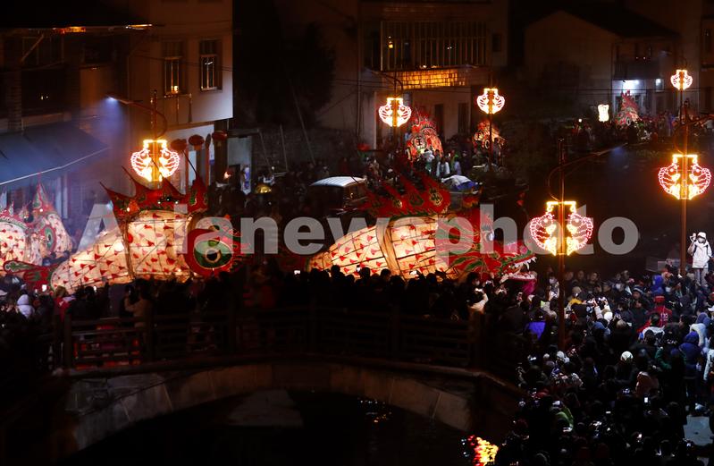 图片说明:2022年2月16日,在安徽省黄山市,汪满田鱼灯表演队伍正在村中嬉游祈福。