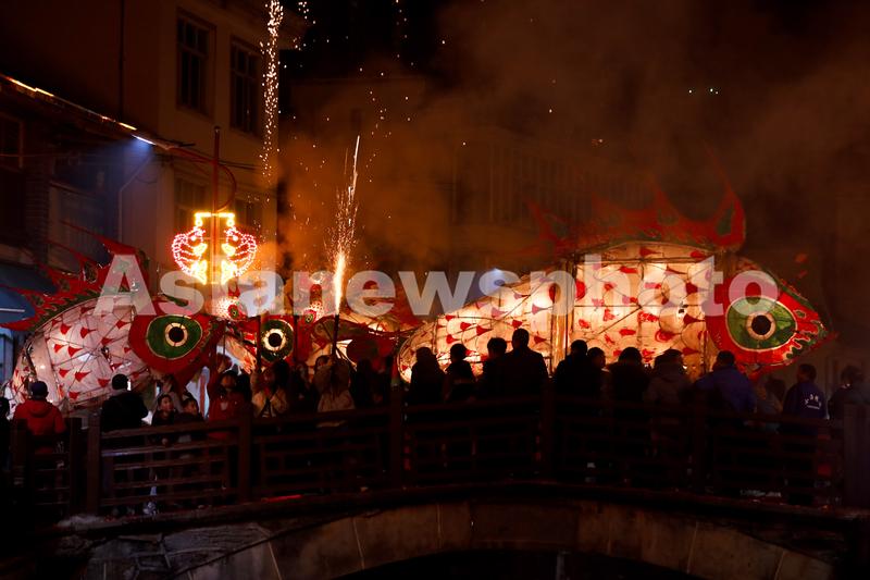图片说明:2022年2月16日,在安徽省黄山市,汪满田鱼灯表演队伍正在村中嬉游祈福。