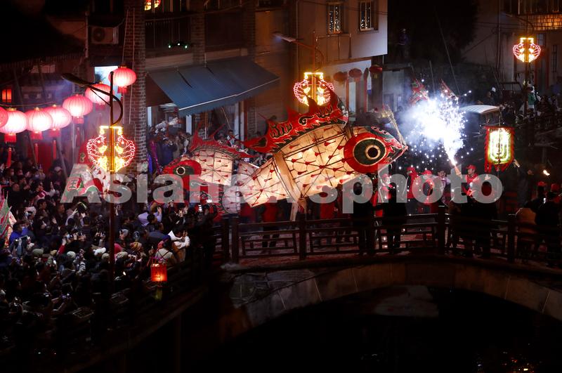 图片说明:2022年2月16日,在安徽省黄山市,汪满田鱼灯表演队伍正在村中嬉游祈福。