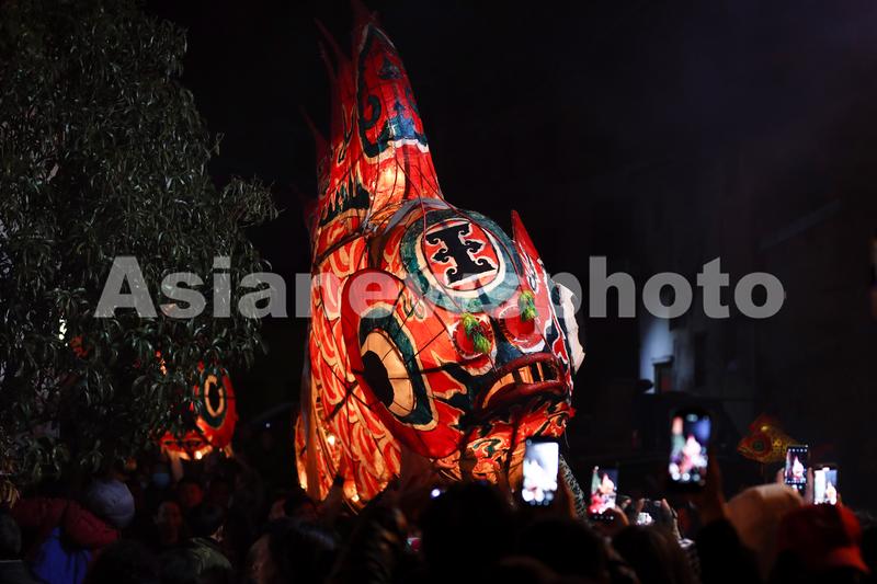 图片说明:2022年2月16日,在安徽省黄山市,汪满田鱼灯表演队伍正在村中嬉游祈福。