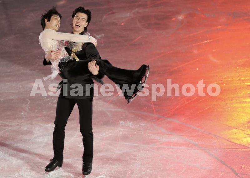 图片说明:2月20日,中国队选手柳鑫宇(后)在表演滑结束后抱起日本队选手羽生结弦。