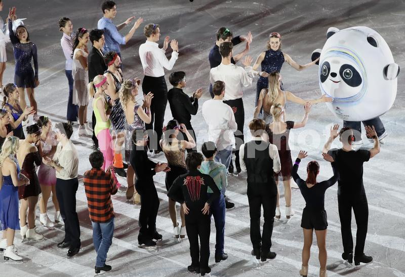 图片说明:2月20日,选手们在表演滑结束后与“冰墩墩”互动。