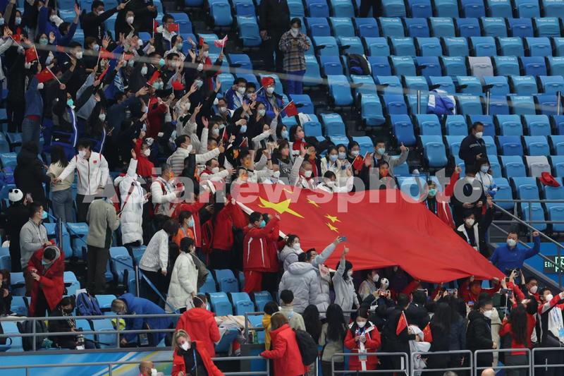 图片说明:2月19日,观众庆祝中国队夺冠。