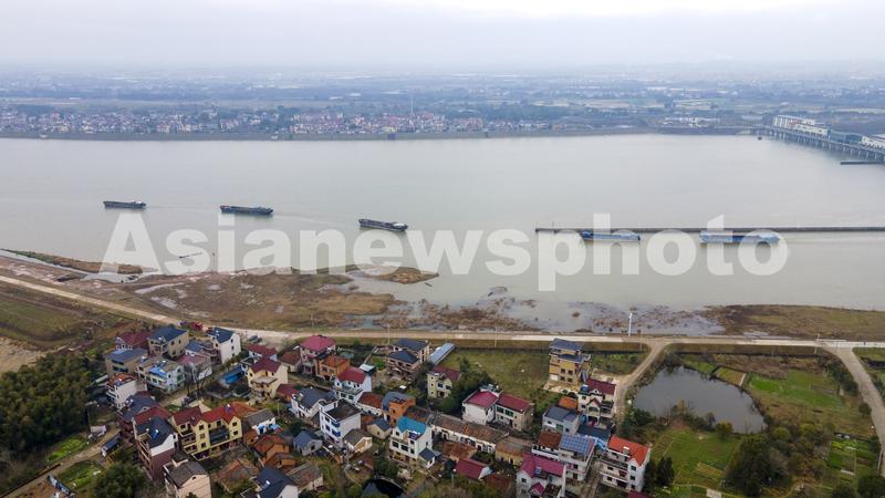 2022年2月19日,浙江省钱塘江中上游衢江航道新年恢复通航首日,一排千吨货船排起长队,驶向衢江上游载货(无人机照片)。