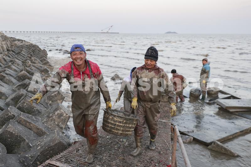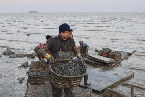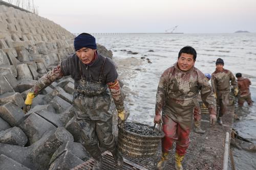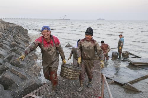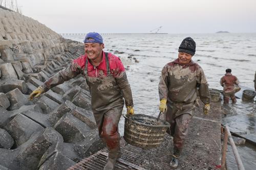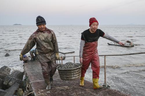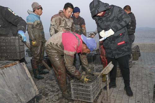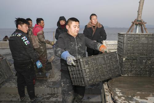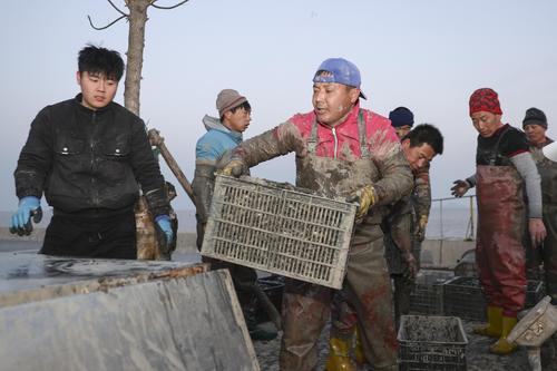 图片说明:2022年2月19日,江苏省连云港市赣榆沿海渔民将刚收获的海蛏运送上岸。