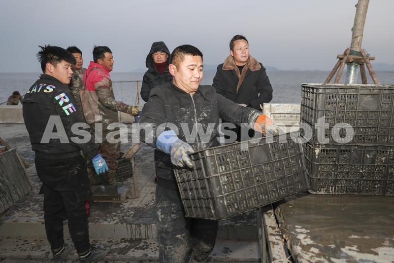 图片说明:2022年2月19日,江苏省连云港市赣榆沿海渔民将刚收获的海蛏装车外运。