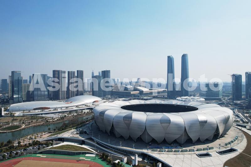 2022年2月21日,从空中俯瞰2022亚运会主会场杭州奥林匹克体育中心。