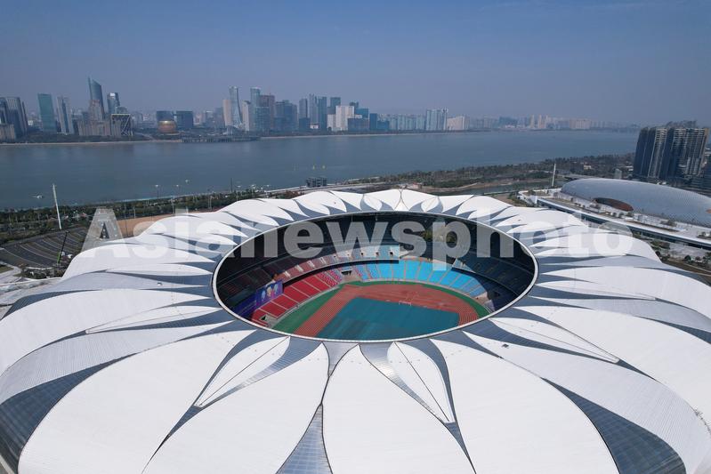 2022年2月21日,从空中俯瞰2022亚运会主会场杭州奥林匹克体育中心。