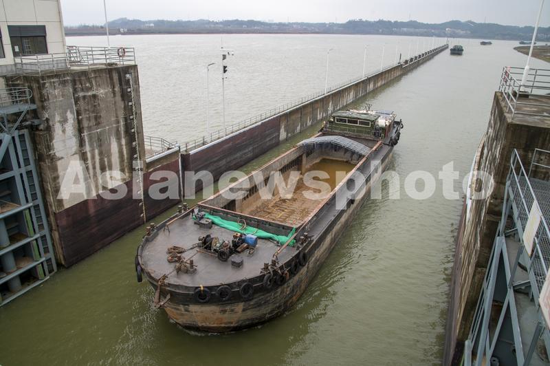 2022年2月19日,浙江省钱塘江中上游衢江航道新年恢复通航首日,姚家枢纽船闸里一排千吨货船有序过闸,驶向衢江上游载货。