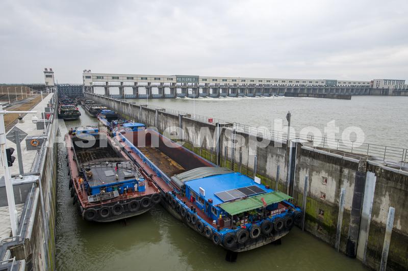 2022年2月19日,浙江省钱塘江中上游衢江航道新年恢复通航首日,姚家枢纽船闸里一排千吨货船有序过闸,驶向衢江上游载货。