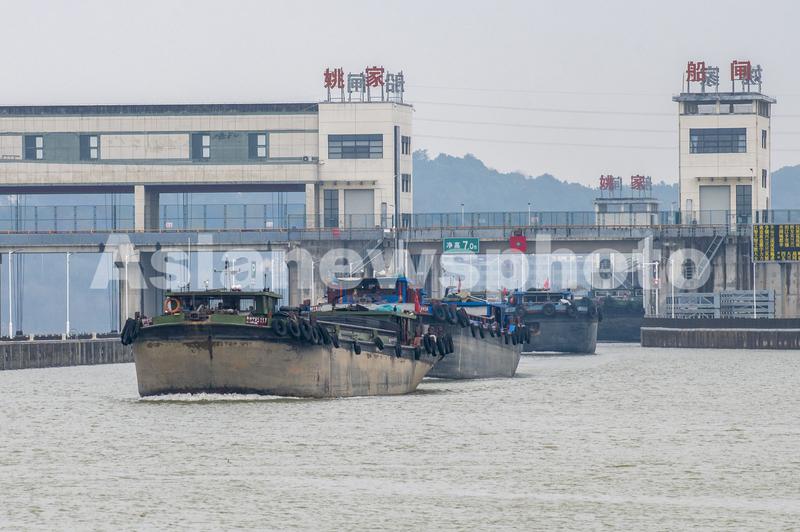 2022年2月19日,浙江省钱塘江中上游衢江航道新年恢复通航首日,姚家枢纽船闸里一排千吨货船有序过闸,驶向衢江上游载货。