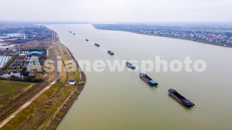 2022年2月19日,浙江省钱塘江中上游衢江航道新年恢复通航首日,一排千吨货船排起长队,驶向衢江上游载货。