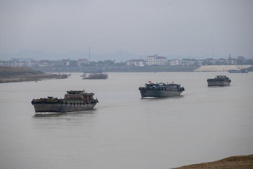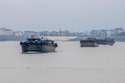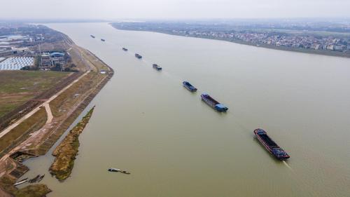 2022年2月19日,浙江省钱塘江中上游衢江航道新年恢复通航首日,一排千吨货船排起长队,驶向衢江上游载货。