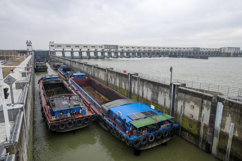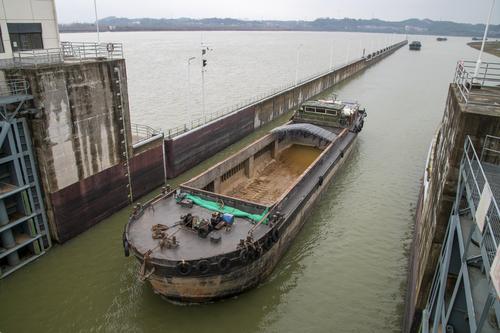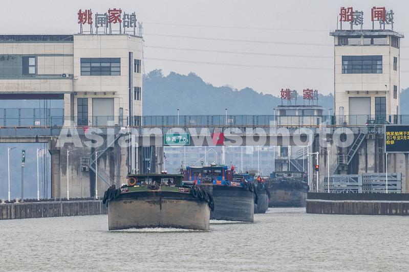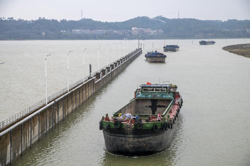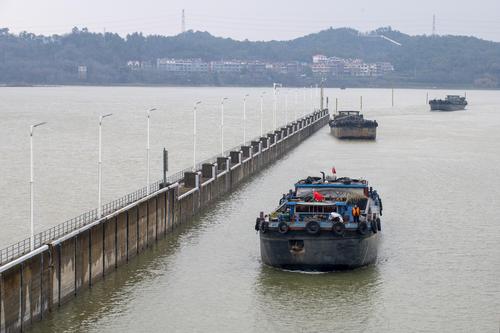 2022年2月19日,浙江省钱塘江中上游衢江航道新年恢复通航首日,姚家枢纽船闸里一排千吨货船有序过闸,驶向衢江上游载货。