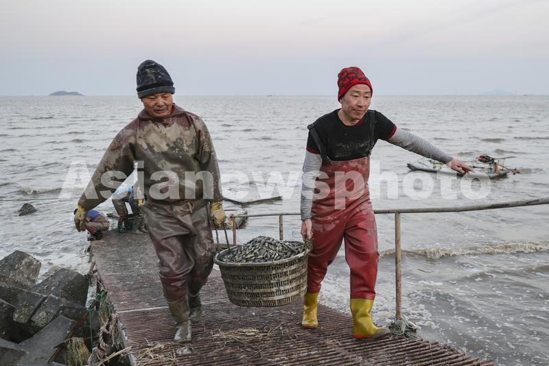 图片说明:2022年2月19日,江苏省连云港市赣榆沿海渔民将刚收获的海蛏运送上岸。