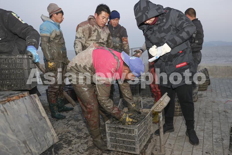 图片说明:2022年2月19日,江苏省连云港市赣榆沿海渔民将刚收获的海蛏进行交易。