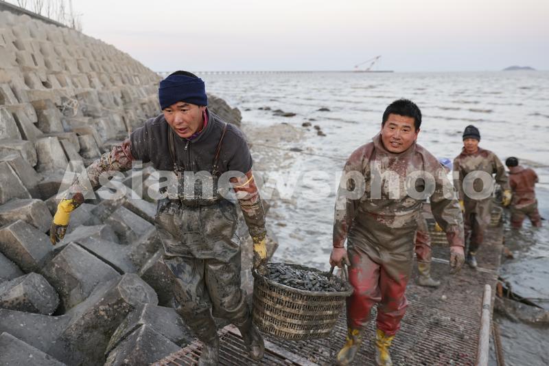 图片说明:2022年2月19日,江苏省连云港市赣榆沿海渔民将刚收获的海蛏运送上岸。