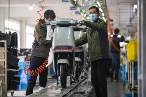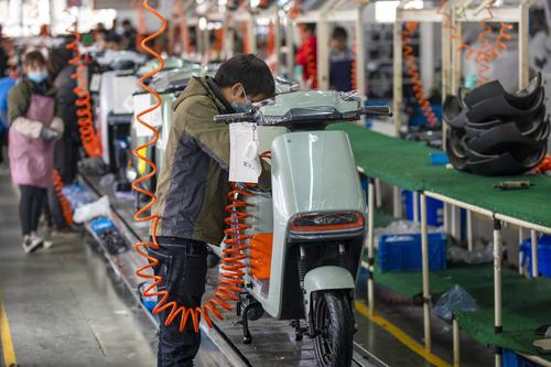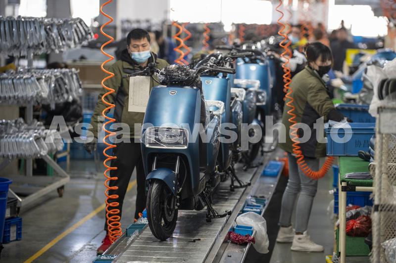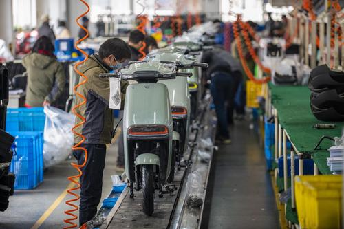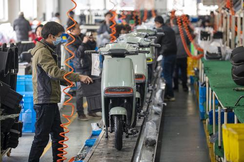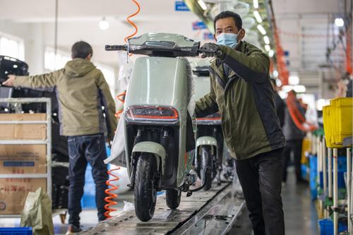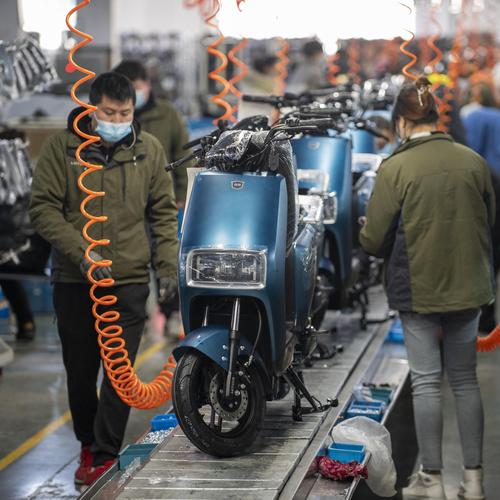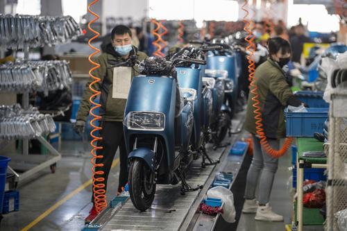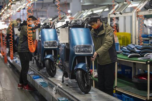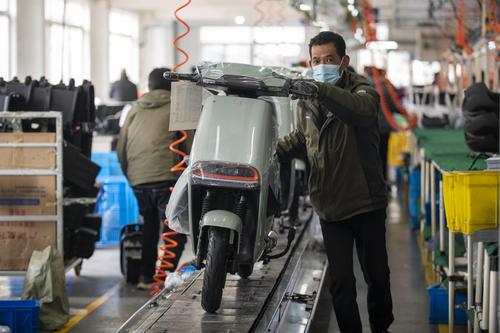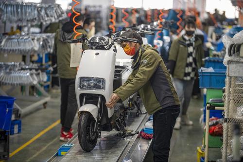 图片说明:2022年2月21日,浙江省金华市浙江绿源电动车有限公司生产线上,一台台崭新的电动车正组装下线。