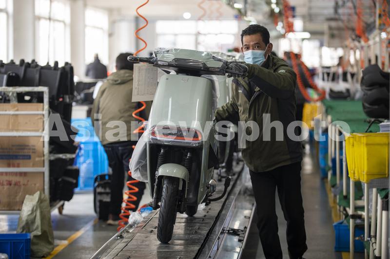 图片说明:2022年2月21日,浙江省金华市浙江绿源电动车有限公司生产线上,一台台崭新的电动车正组装下线。