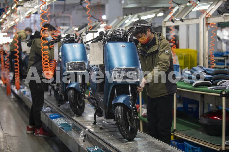 图片说明:2022年2月21日,浙江省金华市浙江绿源电动车有限公司生产线上,一台台崭新的电动车正组装下线。