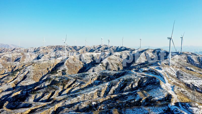 雪后初霁,河北省张家口市宣化区深井镇鱼跃沟山上的风光互补发电场银装素裹,转动的风车、静立的光伏板在白雪点缀下构成一幅美丽图画。