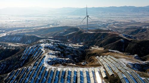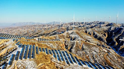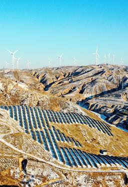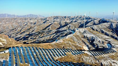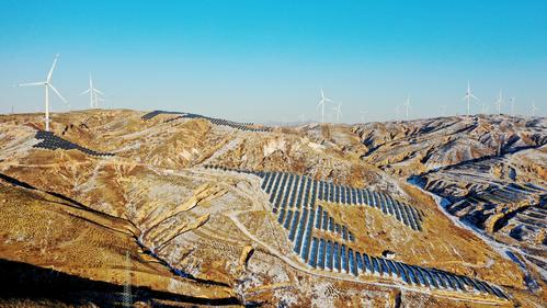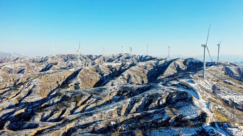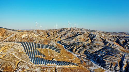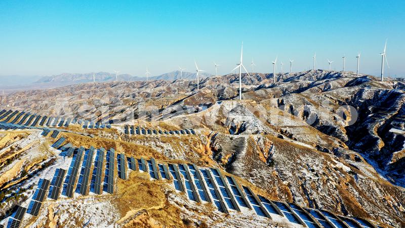 雪后初霁,河北省张家口市宣化区深井镇鱼跃沟山上的风光互补发电场银装素裹,转动的风车、静立的光伏板在白雪点缀下构成一幅美丽图画。