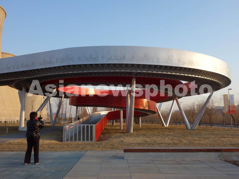 2022年2月24日,北京市石景山区,北京冬奥公园内“冬奥之环”景观吸引游客关注。