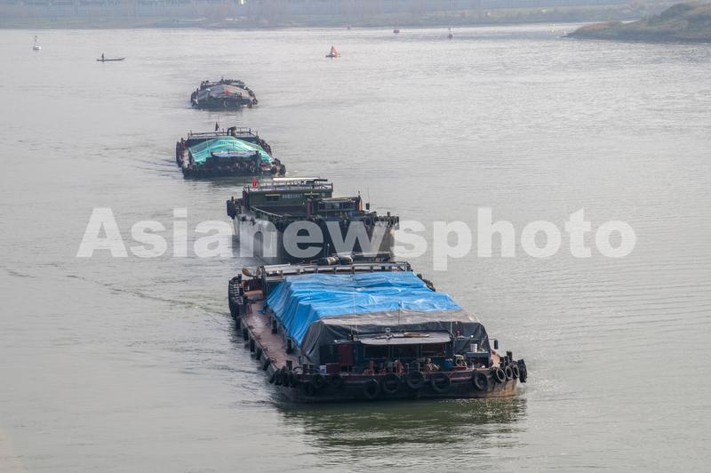 2022年2月27日,浙江省钱塘江中上游衢江航道上,货船排起长队,驶向衢江上游。