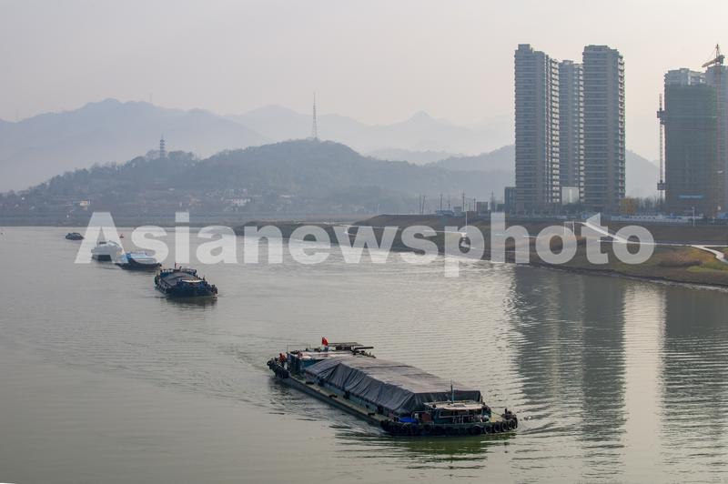 2022年2月27日,浙江省钱塘江中上游衢江航道上,货船排起长队,驶向衢江上游。