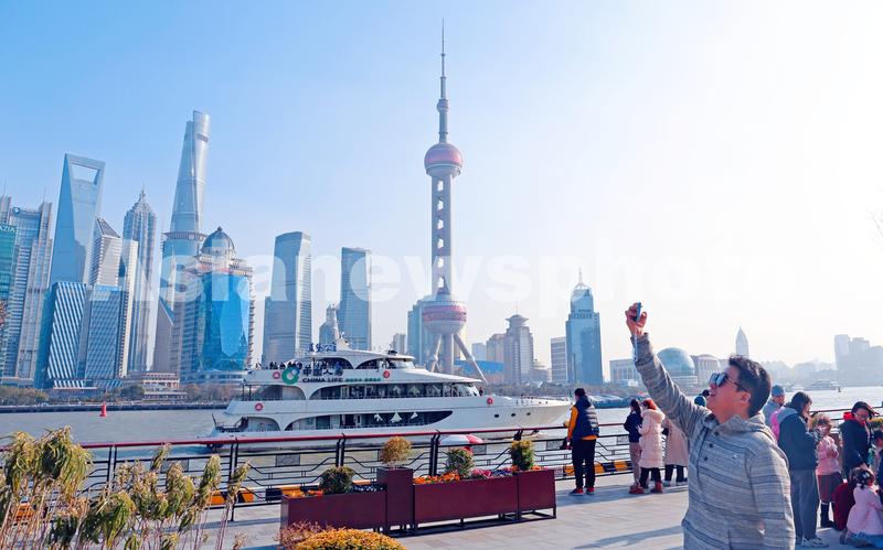 2022年2月27日,上海,北外滩滨江旅游景点人气随气温回升,市民游客漫游在黄浦江畔,远眺对岸浦东的东方明珠及陆家嘴摩天大楼风景。
