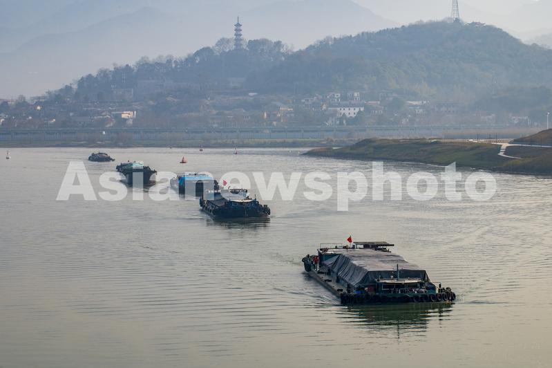 2022年2月27日,浙江省钱塘江中上游衢江航道上,货船排起长队,驶向衢江上游。