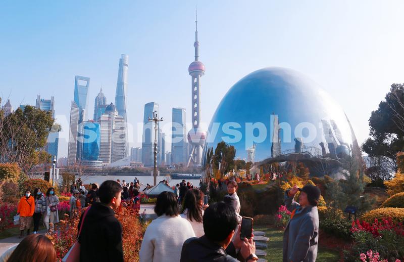 2022年2月27日,上海,北外滩滨江旅游景点人气随气温回升,市民游客漫游在黄浦江畔水晶球绿化带。